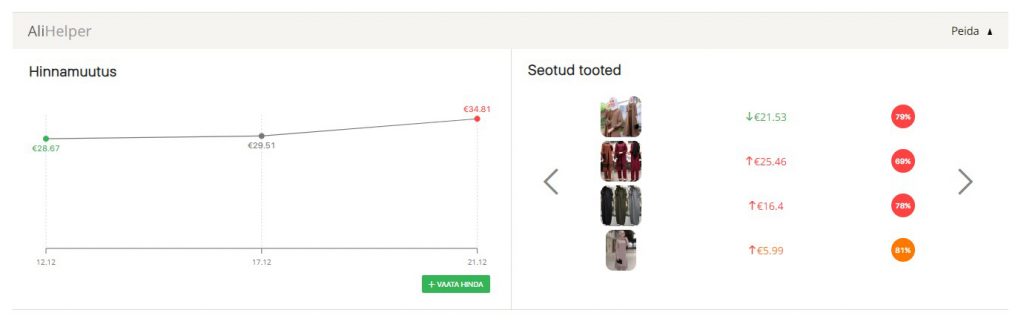 Tasuta laiendus AliHelper näitab AliExpressi hindade dünaamikat. Te saate teada, kui palju toode tavaliselt tegelikult maksab, ja te ei maksa selle eest üle. Laienduses on ka funktsioon “hinna jälgimine”. Kui mõni toode tundub teile kallis, saate tellida teavituse, mis annab teile teada, kui hind langeb. Müüja kontroll aitab valida usaldusväärse kaupluse ja funktsioon “sarnased tooted” – leida sama asja odavamalt teiselt müüjalt.