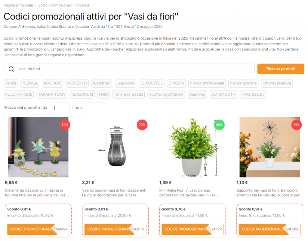 Nella pagina “Buoni sconto Aliexpress oggi” sono raccolte le migliori offerte, che possono essere comodamente ordinate in base alla categoria desiderata, all’entità dello sconto o all’importo minimo dell’ordine. Volete trovare un codice promozionale per un determinato prodotto, ad esempio vasi per fiori? Basta inserire la richiesta nella barra di ricerca. E utilizzando il filtro per mese, è facile individuare gli sconti più rilevanti del momento.