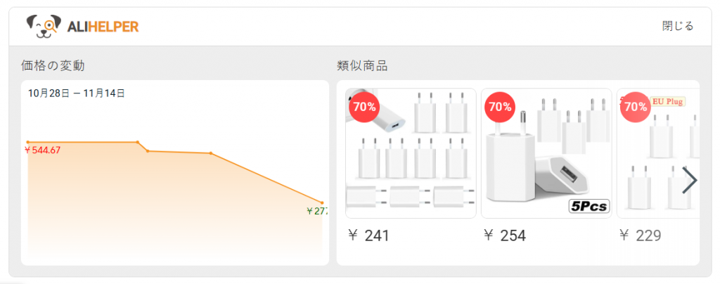 無料の拡張機能AliHelperはAliExpressの価格動向を表示します。商品の本当の価格を知ることができ、過剰な価格を支払うことがなくなります。さらに、この拡張機能には「価格監視」機能があります。もしその商品が高いと感じたら、価格が下がった時に知らせてくれる通知を購読することができます。販売者チェックは信頼できるショップを選ぶのに役立ち、「類似商品」機能は他の販売者から同じ商品をより安い価格で見つけるのに役立ちます。
