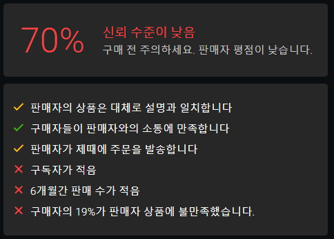 신뢰할 수 있는 판매자는 성공적인 거래의 열쇠입니다. 안타깝게도 2025년에 알리익스프레스 웹사이트는 상점에 대한 짧고 유익하지 않은 평가만 제공합니다. 정직한 판매자를 찾으려면 제품에 대한 많은 리뷰를 연구해야합니다. 5가지 기준에 따라 모든 상점에 대한 객관적이고 상세한 평가를 보여주는 무료 브라우저 확장 프로그램인 AliHelper를 설치할 수도 있습니다. 자세한 내용은‘알리익스프레스에서 판매자 평가하기‘ 문서를 참조하세요.
