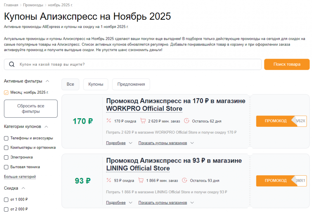 Купоны Алиэкспресс в ноябре – в данном разделе доступна функция фильтрации дисконтных купонов по категориям товаров, величине скидок и цене покупки. Вы также можете искать предложения по отдельным продавцам и даже по названиям конкретных товаров! Чтобы просмотреть код скидки на Алиэкспресс, нажмите на кнопку, находящуюся напротив нужного предложения. Просто скопируйте код и примените его при оформлении заказа. Информация о купонах регулярно обновляется, обеспечивая доступ к актуальным и действующим скидкам.